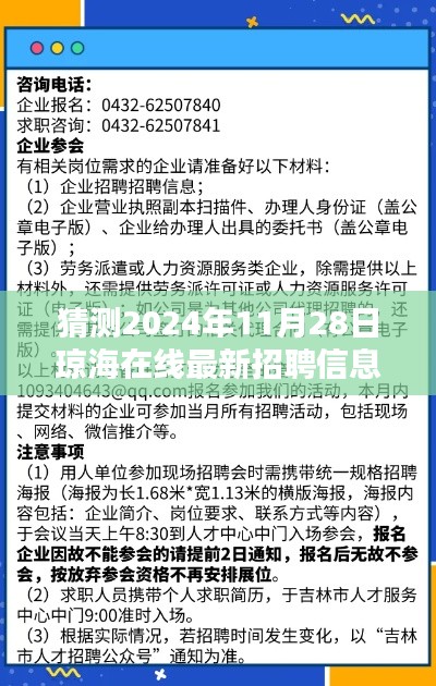 随着时代的进步和技术的不断发展,琼海市的人才招聘市场也在持续演变,作为求职者,了解未来的招聘趋势和最新招聘信息至关重要,本文将围绕“猜测2024年11月28日琼海在线最新招聘信息”这一主题,带您一探未来招聘市场的可能变化。