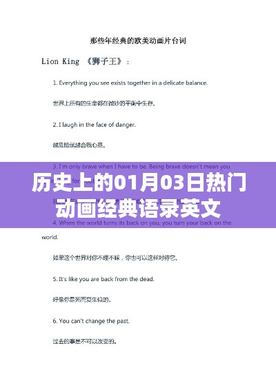 每年的01月03日,动画界都会涌现出许多经典之作,这些作品不仅深受观众喜爱,更留下了许多令人难以忘怀的语录,本文将聚焦于这一天的动画经典语录英文表达,带领读者重温那些充满魅力的瞬间。