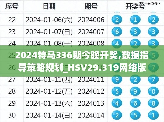 随着2024特马336期的开奖日渐临近,彩民们的心情愈发紧张,在这个关键时刻,如何利用现有的数据资源进行策略规划,提高中奖概率,成为了大家关注的焦点,本文将为您详细解析如何运用HSV29.319网络版的数据指导策略规划,助您在今晚的开奖中取得佳绩。